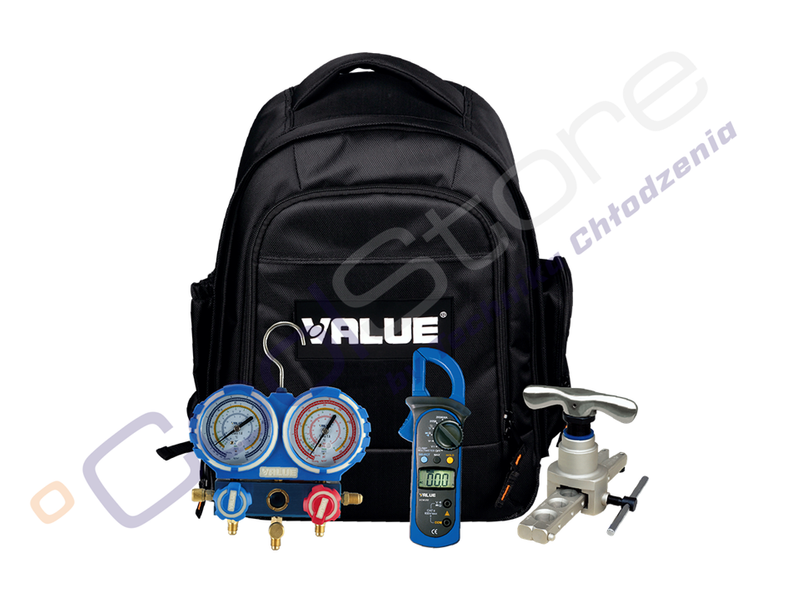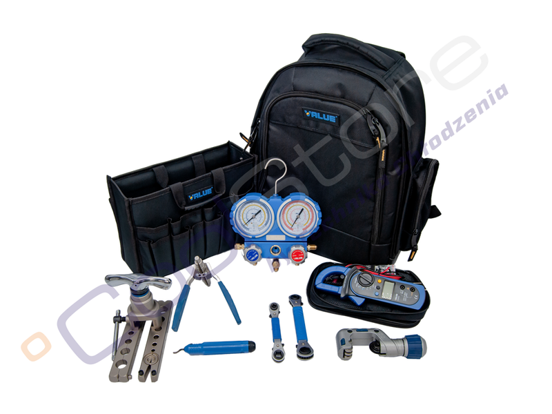 The VALUE VTB‑8C Service Tool Set is a comprehensive kit of service tools designed for refrigeration and air conditioning installations, ideal for HVAC technicians and professional service personnel. The entire set is housed in a practical and ergonomic backpack, which facilitates transportation and organization of tools regardless of field working conditions. The robust construction of the components and their functionality make this set a reliable support for typical installation, diagnostic, and service tasks.