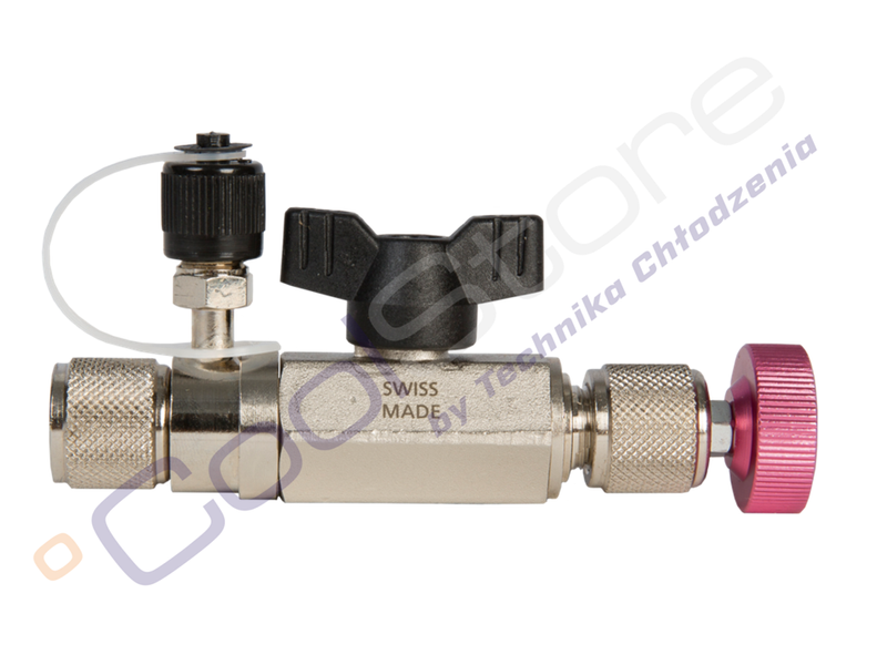 Service tool with 5/16" SAE connection to R410a/R32 and 1/4" SAE swivel outlet for replacing schreader valves under pressure.