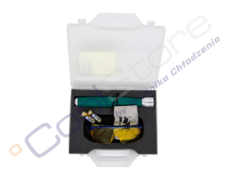 LED Lamp to visualize UV contrast mediums during leak detection. The scope of delivery includes the lamp with UV lamp head, 3 AA batteries and UV protective goggles
