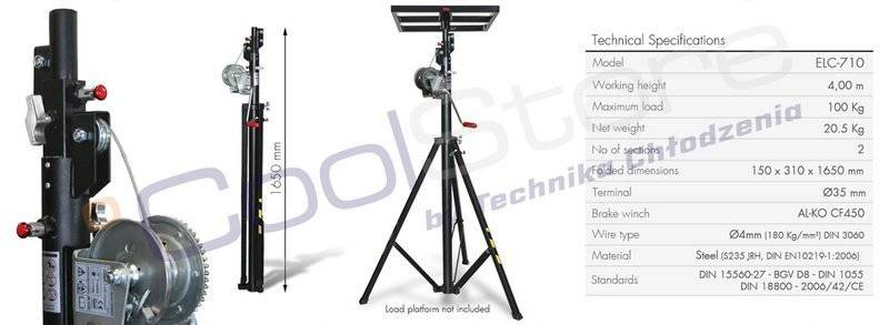 ELC-710 podnośnik towarowy służący do pomocy przy montażu agregatów klimatyzacyjnych i chłodniczych. Podnośnik wyposażony jest w mechaniczną korbkę, służącą do podnoszenia lub opuszczania podestu. Mechanizm wznoszenia działa bez większego nakładu siły. Jego przyjazna i zwarta dla użytkownika konstrukcja ze składaną i regulowaną podstawą (w stylu parasola) sprawiają, że winda ELC-710 jest idealnym uzupełnieniem dla każdego rodzaju zadania podnoszenia, gdzie jest ograniczony obszar roboczy zarówno do użytku na zewnątrz jak i wewnątrz obiektu.