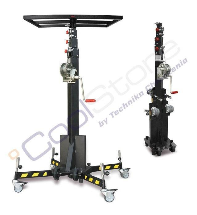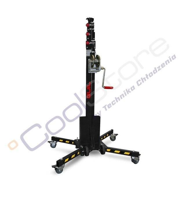 Kompaktowy, teleskopowy podnośnik zaprojektowany do podnoszenia ładunków o masie do 125 kg na maksymalną wysokość 4,56 metra,
