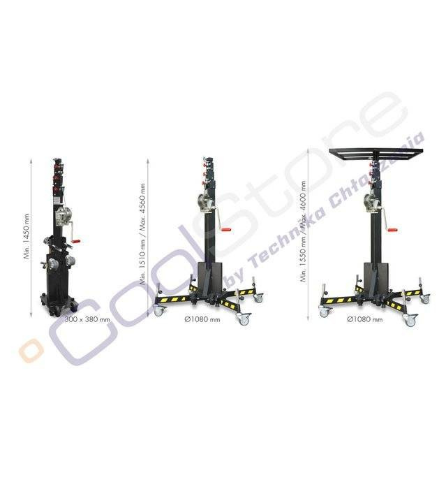 Ten zwijany stojak składa się z 4 teleskopowych sekcji wykonanych ze stali wykończonych teksturowaną czarną powłoką proszkową (epoksydową) specjalną do użytku na zewnątrz. Stabilne sekcje są podnoszone za pomocą nieobrotowej stalowej liny o średnicy 4 mm (0,16 ″) z niezależnym ocynkowanym rdzeniem stalowym (konstrukcja: 7 × 19 + 0), specjalnie zaprojektowanej do podnoszenia dużych ciężarów (DIN 3060).