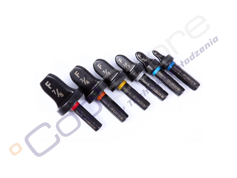 Zestaw do kielichowania SPIN TOOLS F4000 1/4''-5/8'' przeznaczony jest do rur miedzianych jak i aluminiowych o średnicach 1/4" - 6,35 mm , 3/8" - 9,53 mm, 1/2" -12,70 mm, 5/8" - 15,88 mm, 7/8"-22,22 mm. Zestaw końcówek wraz z wkrętarką (nie dołączona do zestawu) o minimalnej mocy 1800 obr/min ( i baterii 18 V) wykorzystuje podczas pracy tarcie dzięki czemu powstaje wysoką temperatura.